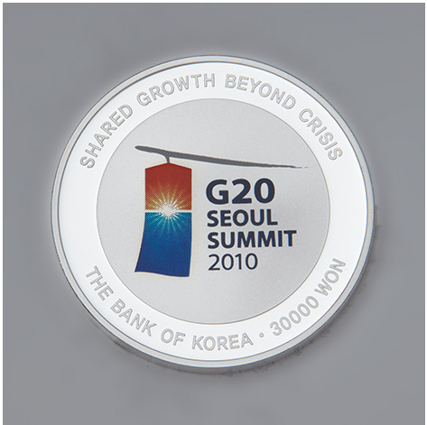 종류 주화 / 기념화폐화폐명 서울 G20 정상회의 기념 삼만원 발행정보 발행일 : 20101103 소재 재질 : silver(99.9) 무게 : 19.0g 규격 33.0mm 설명 - 2010.11.11~12일중 서울에서 개최되는 제5차 G20 정상회의의 역사적 의미를 새기고 대내외에 홍보하기위해 발행 - 도안 : 앞면은 광화문과 G20 회원국 명칭 / 뒷면은 중앙에 서울 G20 정상회의의 심벌인 청사초롱을 채색기법으로 표현하고 상단에 금번 정상회의의 대외메시지(Shared growth beyond crisis)를 넣었고, 테두리는 원형의 톱니모양으로 제조 - 최대발행량은 5만장(국내판매분 45천장, 국외판매분 5천장) |