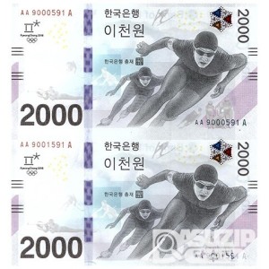 2018년 평창 동계올림픽대회 기념은행권 2000원권 2매 연결권/ AA 9000591 A