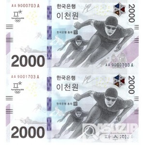 2018년 평창 동계올림픽대회 기념은행권 2000원권 2매 연결권/ AA 9000702 A