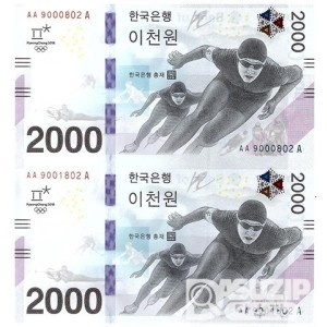 2018년 평창 동계올림픽대회 기념은행권 2000원권 2매 연결권/ AA 9000801 A