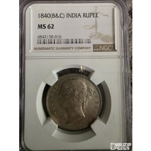 뒷면: 월계수 관 안에 "ONE RUPEE"와 페르시아어(우르두어)로 "Yek Rupiya"가 적혀 있으며, 바깥쪽에는 "EAST INDIA COMPANY"와 연도 "1840"이 새겨져 있습니다.
